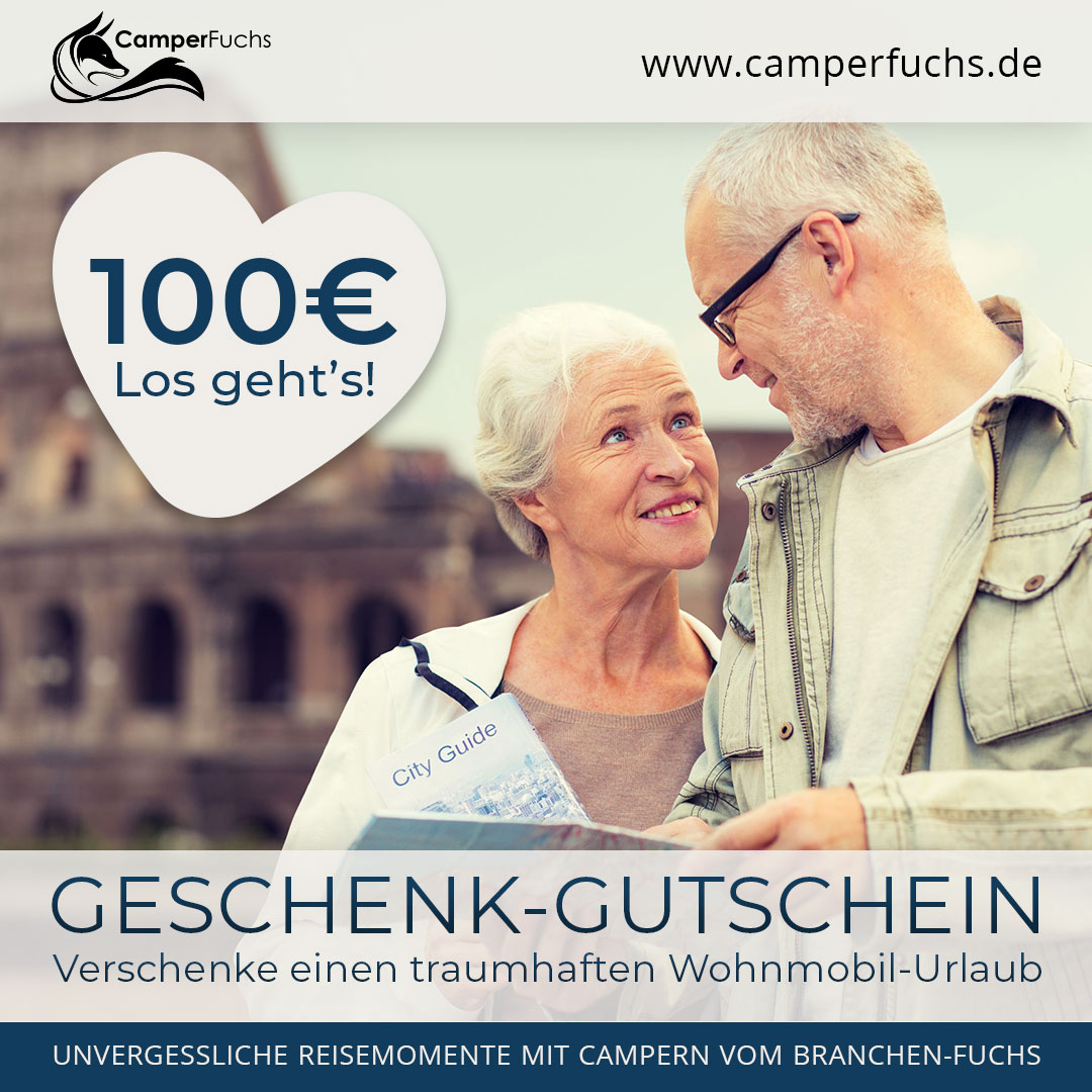 Der Startschuss für ein unvergessliches Abenteuer! Mit diesem 100-Euro-Gutschein verschenken Sie einen erheblichen Beitrag zum nächsten Camper-Urlaub. Das perfekte Geschenk für Hochzeiten, runde Geburtstage oder zu Weihnachten.