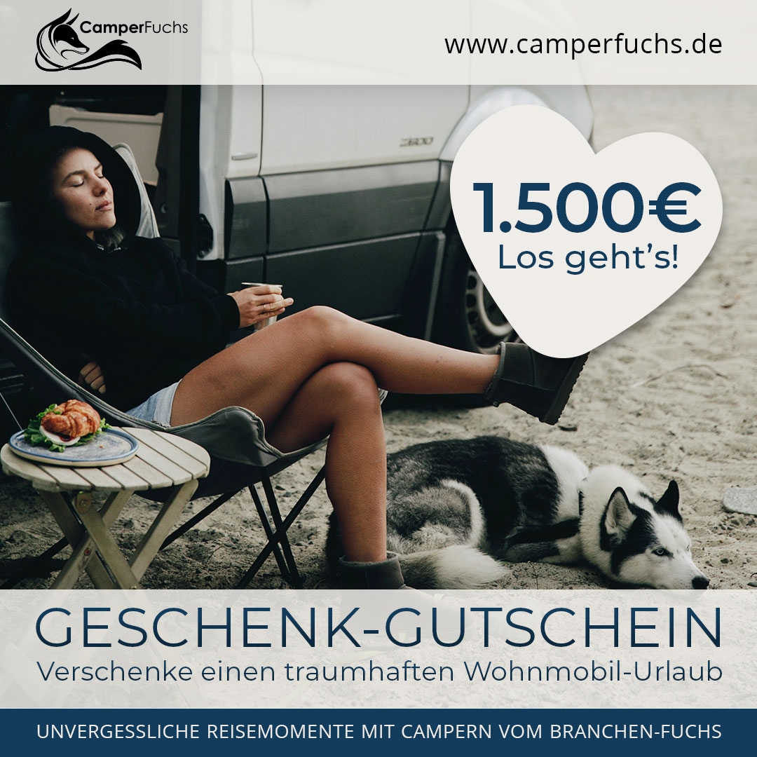 Schenken Sie das Abenteuer Ihres Lebens! Mit einem Gutschein über 1.500 Euro ist eine mehrwöchige Traumreise in der Hauptsaison oder ein luxuriöser Trip im Premium-Camper zum Greifen nah. Ein Geschenk, das Träume wahr werden lässt.